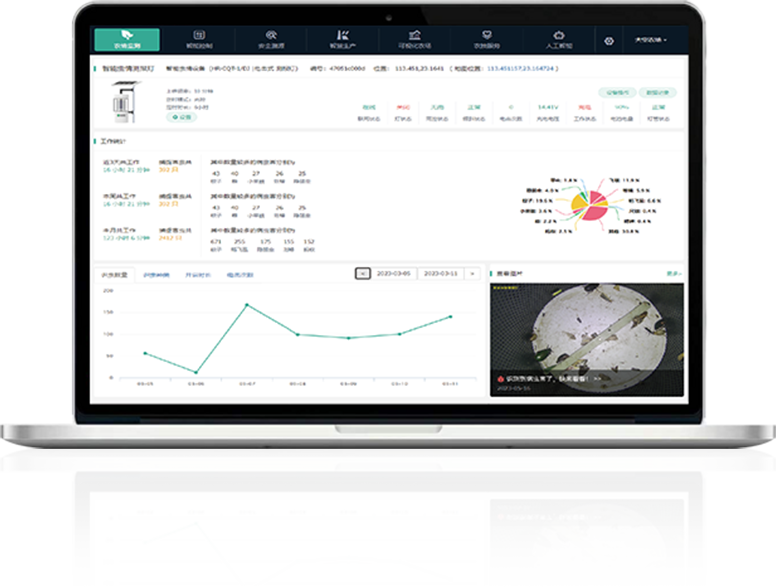 云平臺或APP上實時查看設(shè)備分布點(diǎn)位、工作狀態(tài)、電池電量等,進(jìn)行功能設(shè)置等設(shè)備管理操作;可視化顯示害蟲圖片、種類數(shù)量、變化趨勢,智能分析蟲情報告,基于農(nóng)業(yè)知識圖譜推薦蟲害防治方法。